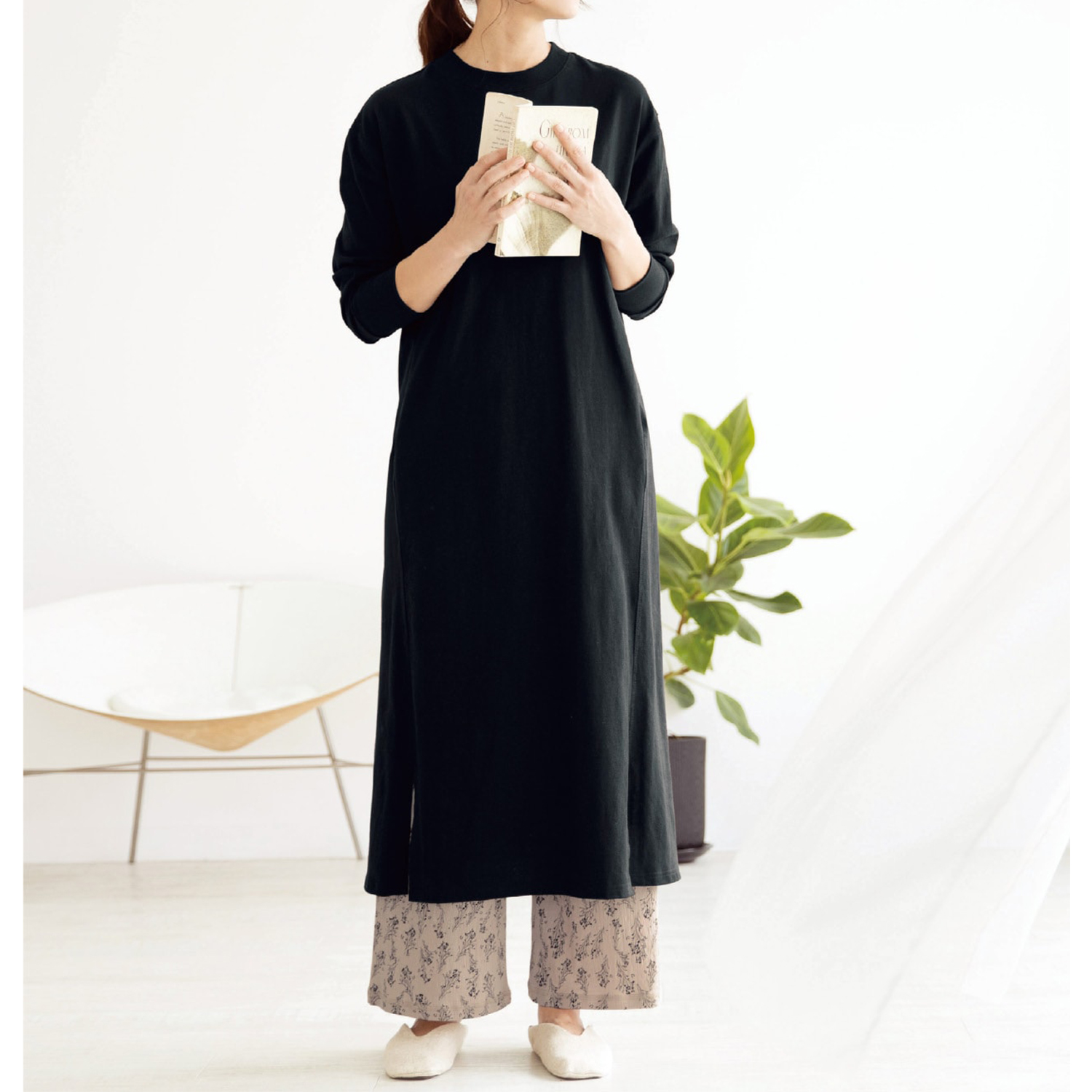 リラックスできるシルエットながら、立体的なパターンやスリットで女性らしく仕上げたワンピースとワイドパンツをセットに。ワンピースはしっかりとした綿100%の天竺素材。パンツは表面にシボ感のある薄手のカットソー素材を使用しています。セットで簡単に旬のレイヤードコーデが完成。単品でも着回せるから、ワードローブが一気に華やぎます。