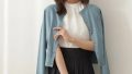 Vネックニットはアイレット編みのスリーブデザインが愛らしいポイント。スカートは縦ラインをほっそり見せてくれる膝が隠れるレングスです。共布ベルトでウエストマークをすると、ニットワンピース風スタイルもバランス良く決まります。